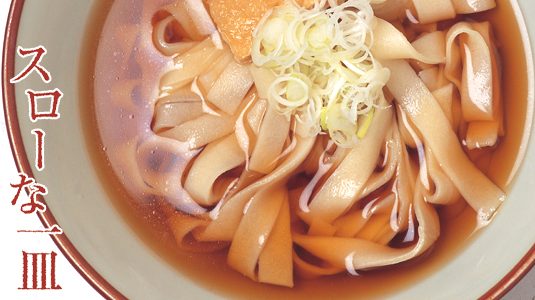 茹でたはっとに熱いかけ汁を注ぎ、油揚げと長ネギをのせただけのシンプルな料理ですが、それだけに手打ちうどんならではのコシの強さと小麥の風味が堪能できる一品。坂本さんの記憶では、農作業が忙しい夏に食べたことはほとんどなかったそうですが、町內の一部には夏に食べる風習が殘っているよう。「『今日ははっとを食べる日だから』と生麺を買いに來る年輩の方がいらっしゃるんですよ」とは、同店のスタッフの山本良子さん。子どもの頃は獨特のコシの強さになじめなかったそうですが、「店で働くようになってからは好きになりました」と笑顔でアピールしていました。