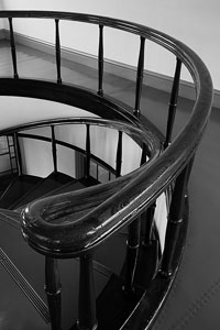 【らせん階段】玄関ホール中央に設けられたケヤキのらせん階段。ゆるやかに3階へとつづく曲線は優美さと気品を漂わせている。