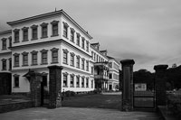 正面は幅約38メートル、高さ約14メートル。まるで城を思わせるような木造3階建。ルネッサンス風を基調としながら、どことなくエキゾチックなバルコニーには華麗な透かし彫りが施されている。外壁に連続する三角ペディメント付窓とともに、屋根のドーマーウインドウも格調高い。西洋文明が日本になだれ込んだ明治時代、鉱山に訪れた多くの人々を迎え入れた事務所は當時、約500メートル北側に建っていた。山を越え、谷を越え、川を渡り、奧深い山里にたどり著いた技術者たちは、緑のあいだに現れた洋館の姿に目を見張ったに違いない。