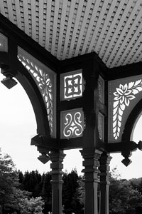 【バルコニーの透かし彫り】藤の花と柱頭の田の字を模した透かし彫りは藤田組の象徴でもある。
