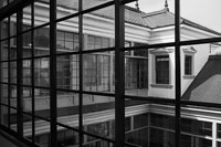 【回廊】ゆがみのあるガラス窓が張られた回廊が、展示室を兼ねた部屋をめぐる。鉱山の歴史や、小坂町の今を知る場でもある。