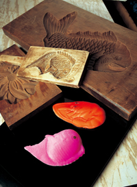 鯛と海老の形のうんぺい(各525円)は注文生産品。こうした「型もの」作りに欠かせない木型は、今では貴重品のようです。