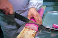 うずまき模様やまだら模様のかまぼこ型のものが一般的ですが、津軽地方では昔から冠婚葬祭の引き菓子に、花や木、魚(yú)などの型で作られるうんぺいを使う習(xí)慣がありました。創(chuàng)業(yè)120余年の弘前市の菓子店「甘栄堂」では今でも、結(jié)婚式やひな祭り用などに鯛や海老、松の形の、法事用にレンゲや菊、蓮などの形のうんぺいの注文が入るといいます。