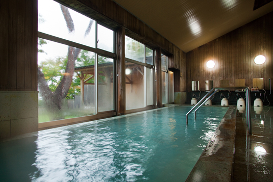 平成12年に作られた日帰り入浴施設「溫泉館」。明るい內湯と露天風呂の湯は、もちろん源泉かけ流し。