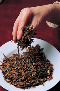 8月末から9月に収穫した茶葉は、乾燥してたたき、使う分だけを廚房の大きな釜で煎ります。この時お茶の風味や色がしっかり出るよう、30~40分かけてじっくり煎ることがポイントです。