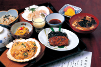 「東北ではおかゆといえば一般的に、『かさを増やすための貧しい食事』というイメージがありますが、この茶がゆは當時の旦那衆だけが味わった贅沢な食事なんですよ」と説明するのは、駅前で100年以上も営む「松浦食堂」の三代目?松浦敬祐さん。奧様のリツさんと一緒に12~13年前から、茶がゆに郷土料理7品を付けた「茶粥定食」(1500円?2人前から要予約)を提供しています。