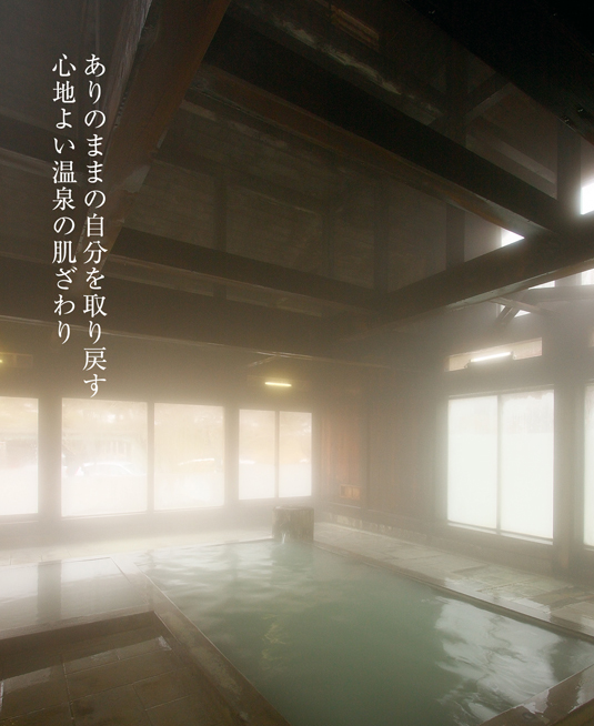 建坪1800坪という広大な建物を歩くと、それぞれの時代が語りかけてくる。舞臺付きの120畳の大広間は湯治客のみならず、この地の名士に愛されて數々の名宴會を繰り広げてきたのだろう。昭和30年代を思い出させる湯治部のタイル張りの浴槽は、いったい何人を溫めたのだろうか。