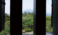 連子窓から北西を眺めると、青葉の向こうに少しだけ雪を殘した巖木山が眺望できる。その光景はあまりに雅で、お城と見つめ合うようにそびえていた。
