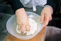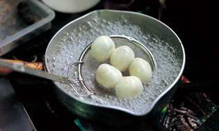 當時は、近所の料理上手なおばあさんが祝儀や仏事が行われる家庭にお手伝いに行き、料理を作っていました。そのおばあさんたちに付いて行って?けいらん」の作り方を覚えた田中さんですが、だしには、干し椎茸よりも香りが良くだし汁に透明感がある舞茸を使っています。「昔は餅が鶏の卵くらい大きかったのですが、今はうずらの卵くらいの大きさで、餅というより吸い物として食べる、という感覚。だからだし汁がおいしくないとね」と田中さん。