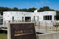 小川原湖の近く、森の中を進むと突如現れる不思議な空間。デッキを歩いて記念館に向かうと、壁には演劇実験室「天井桟敷」のシンボルだった仮面のモニュメントや、アラーキーなど寺山ゆかりの人から寄せられた言葉が、タイルアートとしてはめ込まれている。