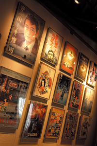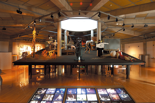 舞臺には、寺山が演劇や映畫で使った大道具&小道具がオブジェの如く並び、それぞれがゆっくりライトアップされていく。粟津潔氏のデザインによる記念館。