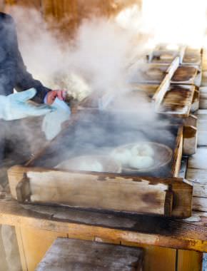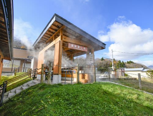 併設された「溫泉蒸し処」では、間歇泉の溫泉の蒸気を利用して、魚介や野菜の蒸し料理が味わえる