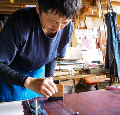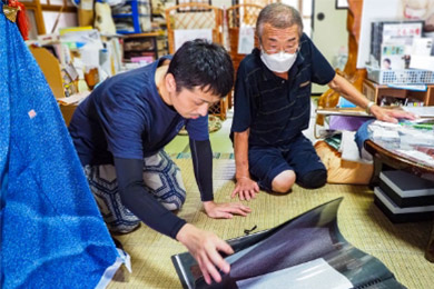 現(xiàn)在、江戸小紋を手掛ける工房のほとんどが機(jī)械染めで、しかも分業(yè)制で行われていますが、『形幸(かたこう)』は、創(chuàng)業(yè)以來(lái)手染めを守り、仕上げの『干し』まで一貫して行う、須賀川市唯一の工房です?!?手染め、一貫作業(yè)という)どこもしていないことをしてきたから、今も続けられているんだと思います」そう語(yǔ)るのは、形幸三代目の染師、渡辺幸典さんと、息子で四代目の泰幸さんです。