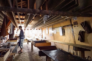 (寫真左)形幸三代目の染師、渡辺幸典さん(右)と、息子で四代目の泰幸さん。幸典さんは、長(zhǎng)年にわたる仕事ぶりが評(píng)価され、「福島の名工」にも選ばれている (寫真右)明治時(shí)代から使われている「型付け」の作業(yè)場(chǎng)
