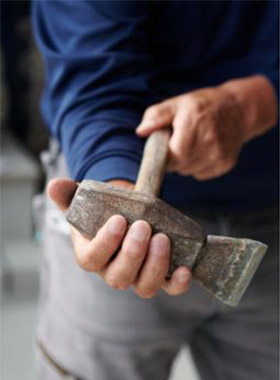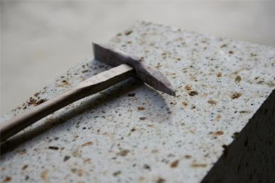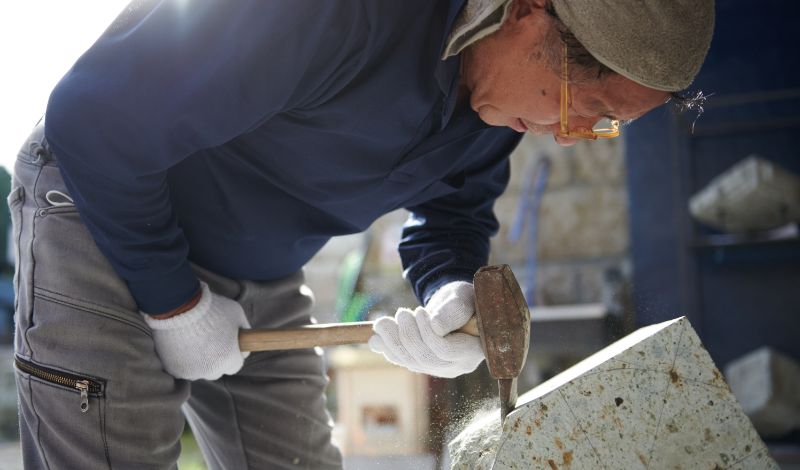 大谷石の特徴でもある、肌面に散らばる白色や青色、茶色のさまざまな斑點(diǎn)は、石英や長(zhǎng)石類、黒雲(yún)母、輝石など、異なる石質(zhì)の固まり?!弗撺健工群簸肖欷氩枭伟唿c(diǎn)のように、時(shí)が経てば空洞になるような脆い粘土質(zhì)も混在しています。ひとつの石塊でも場(chǎng)所によって石質(zhì)が違うので、石を叩いたときに伝わる感觸で、次に出てくる層を瞬時(shí)に見(jiàn)分けるのだとか?!溉幛椁萍庸い筏浃工し疵?、打ち方の力加減を間違えると思った以上に大きく割れる。そこが緊張するし、そこが大谷石の面白いところ」と、渡邉さんは語(yǔ)ります。