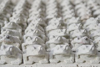 (寫(xiě)真右)大谷町に古くから伝わる縁起物のカエルを、大谷石で彫刻。大願(yuàn)成就の他、「無(wú)事帰る」の願(yuàn)いを込めて