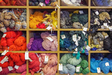 (寫真左)染めも紡ぎも手作業で仕立てられた毛糸。これまでにつくられた毛糸の多くは保存されており、色づくりの參考にしている