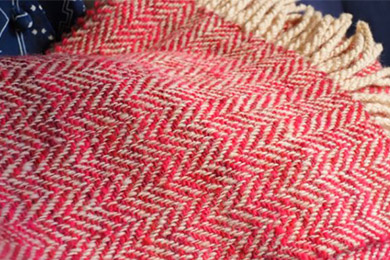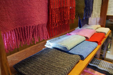 みちのくあかね會でつくられるホームスパンは、大判のストールからコンパクトに丸めやすい幅16cmほどのマフラーなど、ネックウェアだけでもさまざまなバリエーションを揃え、ジャケットやコートなどもつくられています。糸一本や端切れも無駄なく使われ、ピンクッションやブローチ、オーナメントなどの小物雑貨も、しっかりとした風合いです。実際にマフラーを巻いてみると思ったより織目が細かく、すぐに暖かさを感じます。しかも、身につけているのに重さを感じさせないほど軽いことにも驚きです。完成するまで數カ月を要するホームスパンは、色褪せないデザイン性も相まって、母から子、そして孫へと、三代にわたって愛用する人も少なくありません。