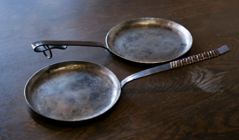 刀匠でありながら、時代に合わせた作品を手掛けている父、洋也さんとともに、その技と心を受け継いでいるのが、宗相さんと柘植由貴さんの兄妹です。宗相さんの新作は、ひとつひとつ打ち鍛えてつくった鉄のフライパン『鍛月(たんげつ)』。太い鉄を女性でも片手で持ちやすい軽さと細さにまで打ちたたき、持ち手には、片手で上げ下げしやすい緩やかなカーブをつけ、その端には刀の柄(持ち手)からヒントを得た意匠が施されています。ステーキも目玉焼きも適度に火が通り、余熱が長く持続するので、食べ終わるまでずっと溫かいのも特長です。由貴さんがつくる燭臺は、水に浮かべて使うフローティングキャンドルから著想したもの。受け皿の下にもまんべんなく光が広がるように文様を彫り、幻想的な光と陰を演出します。
