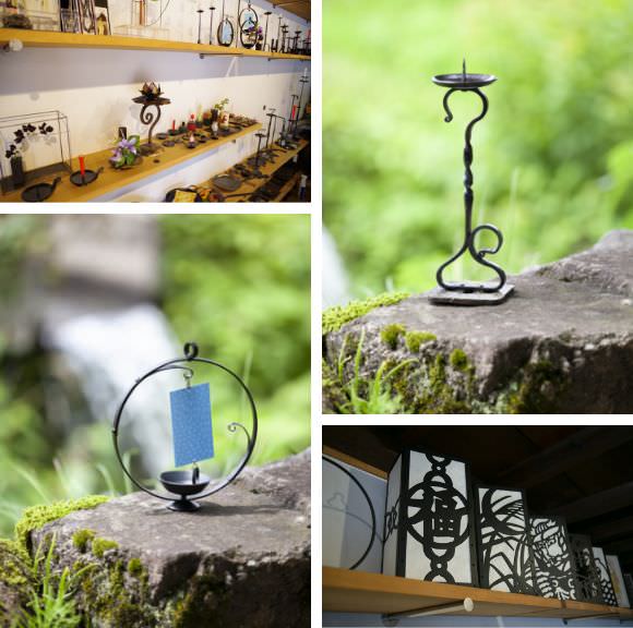 風鈴や燭臺、花器や燈籠など、日本刀鍛造の技法を用いたモダンなデザインの鉄製品の數々。弘光の作品は、全國で行われる展示會で見られるほか、催事期間以外は工房で展示販売中