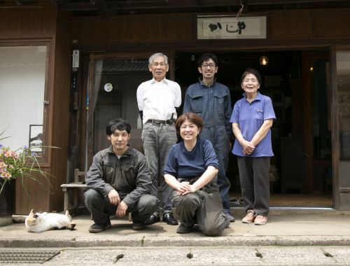「鍛冶工房弘光」を守る小藤さんご一家。 (寫真右)後列左から父洋也さん、宗相さん、母睦子さん、前列左からスタッフの三宅大樹さんと、妹の柘植由貴さん。愛貓のみーちゃんも。「鍛冶工房弘光」がある通りは、鉄の神様を祀る金屋子神社に続く街道の宿場町だった。「安來まで足を延ばしてもらって、作品の背景をゆっくり感じてもらえたらうれしいです」(宗相さん)