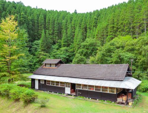 標高約600m、小國町の里山にたたずむ「かける木工舎」の工房。周囲は小國杉の杉林に包まれている