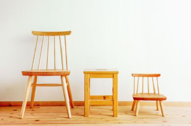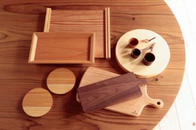 取り扱う素材は、小國杉などの小國町産材を中心に國産材、外國産無垢材など。椅子、テーブル、ソファなどのオーダー家具から、キッチン雑貨や食器まで手づくりで制作。寫真右下は、小國町で満1歳を迎える子どもたちに贈られる積み木「wood start」