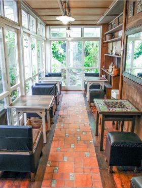 (寫真左)堂前さん自作の椅子やテーブルを配した箱庭カフェ。素樸な中庭を眺めながら、自家製スイーツが味わえる