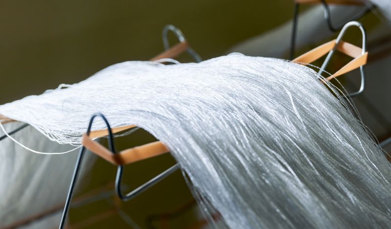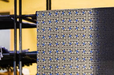 また織元として「糸」にこだわるのも壽紬工房流。規(guī)定糸の養(yǎng)蠶の絹糸にはない個(gè)性を放つ絹糸を入手するためアジア各地を訪問(wèn)し、インドアッサム地方の野蠶からしか取れない絹糸ムガ?シルクや、凹凸の糸が獨(dú)特の光沢をみせるタイシルク、希少な與那國(guó)紬糸などを収集。太さや凹凸感、光沢や肌觸りがさまざまな野蠶の絹糸から、新しい織物を生み出しています。そもそも、糸から反物をつくる『壽紬工房』のような存在は、大島紬の世界でも今では珍しくなったといいます。