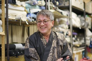 (寫(xiě)真右)大島紬の作務(wù)衣を著る、壽紬工房/大島屋の代表、佐藤邦弘さん