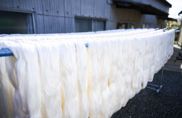 一反に必要な経糸は1,288本。極細(xì)の絹糸が絡(luò)まらないように、72本ずつ整経し、糊付けして天日で乾かす。糊付けするのは経糸のみ