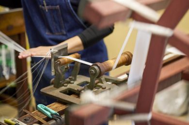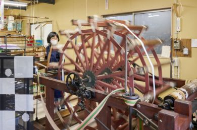 工房?jī)?nèi)の大きな糸繰り機(jī)。織りの途中で糸が絡(luò)まらないように、一本一本重ならないように巻いていく