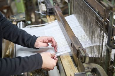 作業(yè)場(chǎng)に並ぶ機(jī)織り機(jī)は、廃業(yè)した機(jī)織り職人から買(mǎi)い取ったものも多く、部品を交換しながら使い続けている