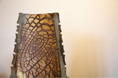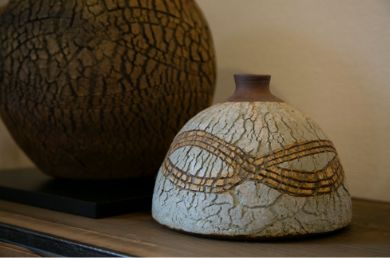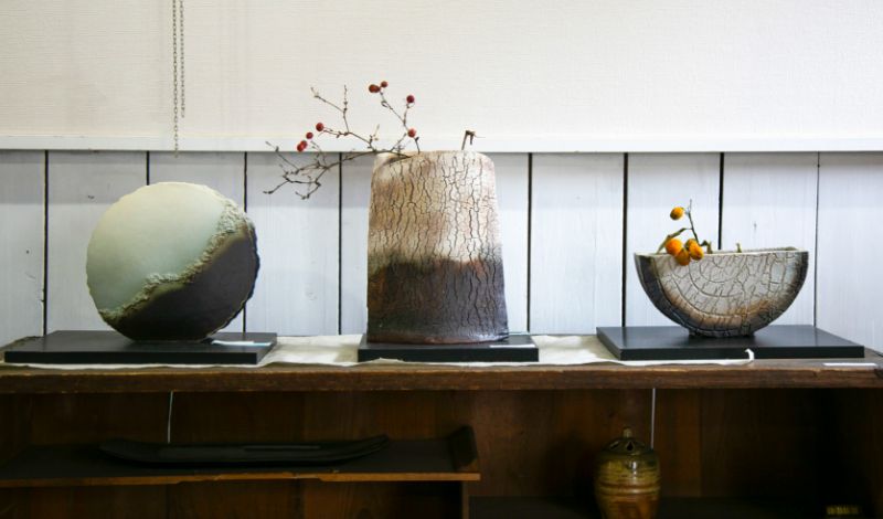 47年前、夫?靖(せい)さんの転勤先だった栃木で、公民館の陶蕓講座に入ったことから陶蕓人生が始まった厚子さん。『裂華紋(れっかもん)』というオリジナルの技法を用いた作品は、日照りの続いた大地や古木の樹皮を思わせる大膽な亀裂が特徴です。収縮率の異なる土を中と外の2層に重ねることで、わざとひび割れを発生させているとか。本來失敗作や不良品につながるひび割れの、「ひとつとして同じものはない裂け方」に魅力を感じたと厚子さんは言います。長年の試行錯誤の末、たどり著いたその苦労が花開き、1999年(平成11年)に日展に初入選、以降7回の入選をかさね、現(xiàn)在も精力的に國內(nèi)外で個展を開催しています。