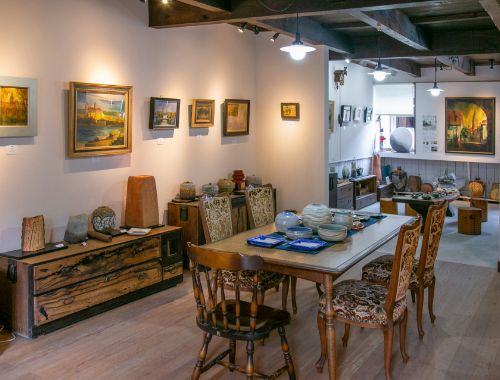クンストホーフとは、ドイツ語で「蕓術(shù)の広場」という意味。この場所から、蕓術(shù)が身近な存在になるようにと願いを込めて名付けられました。ギャラリー內(nèi)に所狹しと飾られているのは、津和野町出身の陶蕓家、中尾厚子さんの作品と次男でドイツ在住の畫家、成(あきら)さんによる油絵。他にも、ドイツの蚤の市で見つけた雑貨や、厚子さんがつくった陶食器『つわぶき葉皿』なども展示販売しています。ちなみに津和野の地名は「つわぶきの生い茂る野」をその名の起源に持つといわれています。