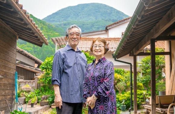 作品の話、津和野の話を笑顔で話してくれる厚子さんと、夫の靖さん。「観光客の方から『津和野に來てここが一番面白かった』と言われます(笑)」奧に見えるのは名峰青野山