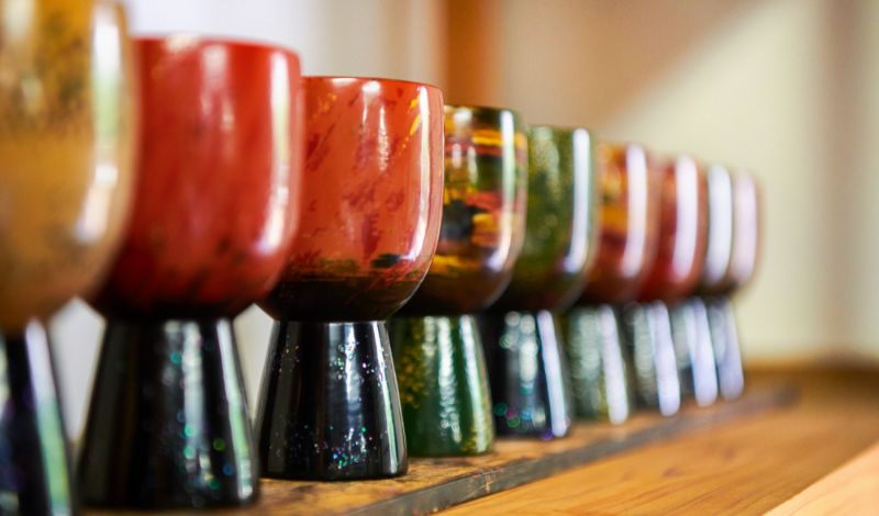 漆器づくりは、木地づくり、漆の塗り、蒔絵や螺鈿を施す加飾まで、分業制で行われてきました。マルサ漆器製造所ではあくまでも塗りが中心ですが、木地づくりから加飾まですべてを行いながら、マルサ漆器製造所獨自の漆器をつくり続けています。達夫さんは作品づくりにも精力的で、日本伝統工蕓展では8回入選。一般的な商品をつくる上でも、作品出展はプラスに作用し、盃や馬上杯、盛り付け用途の幅広い長角皿まで、さまざまなデザインの漆器をつくるようになったと語る達夫さん。お店には、マルサ漆器製造所ならではの漆器を楽しみたいというファンも遠方から訪れるそうです。