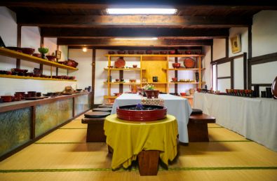 江戸時代建立の塗蔵を店舗にしたマルサ漆器製造所。1階は展示スペース、2階は工房になっている