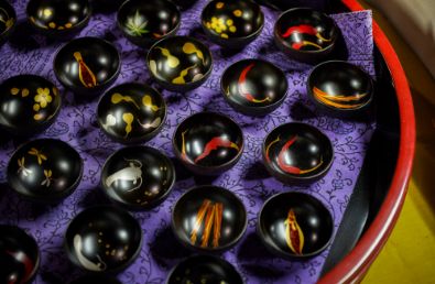 (寫真左上)筍や桜など、一つひとつに季節を描いた「絵付石目塗盃」