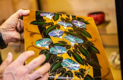 (寫真右下)豪華な朝顔文様の箱。蒔絵や螺鈿の技術を駆使している