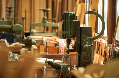 國道沿いにある和山さんの工房。さまざまな木工機械と自然乾燥中の木材が空間を埋める