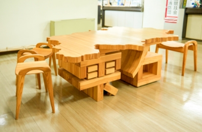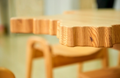 和山さんの作品は、各地で行われる作品展のほか、道の駅や雫石町役場などで見ることができます。雫石町役場2階には、町有林の伐採木材を使ったテーブルを設置。雫石町の全図を描いた天板と、漢字で「雫石」とかたどった腳など、一度見れば忘れられないユニークなデザインが印象的です。また1階には『七つ森ベンチ』も設置。座り心地も取っ手の感觸も柔らかで、木のやさしさがあふれています。「四ツ家さんには『材料を上手に使うことが最高の技術』と、福田さんからは『デザインはコミュニケーション』と學びました。今後も目の前のことをやりつつ、子どもたちと一緒に何かつくり続けられたらと思っています」(和山さん)