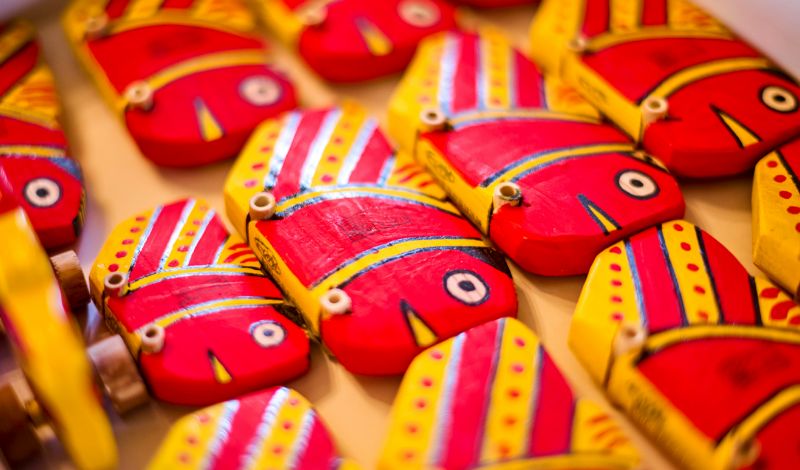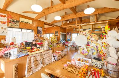 (寫真左)代表的な信仰玩具「鯛車」が工房の看板 (寫真右)玩具づくりの最盛期に訪れた工房內はカラフルな玩具でいっぱい