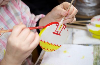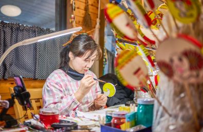 次女の佐藤ゆうこさんは、ぽんぱちの絵付けの最中。「手描きなので馬の顔はそれぞれ微妙に違います」