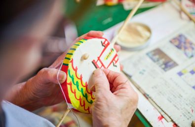 鹿児島神宮には12品目もの信仰玩具が伝承されています。江戸時代から9品目の信仰玩具づくりを請け負っているのが「工房みやじ」。現在は、花見ユリ子さんと長女の森山かおりさん、次女の佐藤ゆうこさん親子がその仕事を受け継いでいます。木の香りが漂う工房の中は、制作途中の玩具でいっぱい。鹿児島県の伝統的工蕓品に指定されている鯛車(たいくるま)、香箱(こうばこ)、地元で「ぽんぱち」と呼ばれる初鼓(はつつづみ)もここでつくられ、鹿児島神宮に納められています。