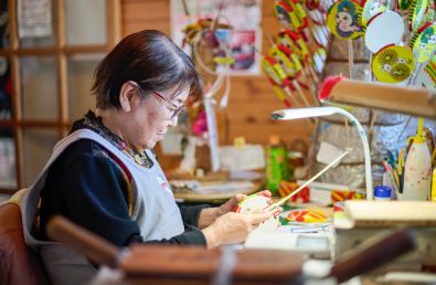 「ぽんぱち」を叩く豆をつけている花見ユリ子さん。3人とも全作業ができるが、繁忙期は分業制で対応。信仰玩具は、古くは農閑期の仕事としていた