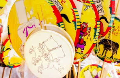 和紙を叩く大豆の音が「ぽん、ぱちっ」と響くことから「ぽんぱち」と呼ばれる豆太鼓。太鼓の竹枠づくりからはじめる工房みやじでは代々、鹿児島の伝統的工蕓品、蒲生和紙(かもうわし)の和紙職人に、ぽんぱち用に手漉きしてもらった和紙を採用。丈夫で、経年による劣化が少なく、絵具や日本畫材で描く絵の色味もきれいに出るとか。つくり方や糊の調合など、受け継いでいる技術を守るために、家內制手工業による信仰玩具づくりが続いています。