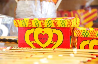 鹿児島神宮は「山幸彥」と呼ばれる天津日高彥穂穂出見尊(アマツヒダカヒコホホデミノミコト)と、豊玉比売命(トヨタマヒメノミコト)を御祭神としています。代表的な信仰玩具「鯛車」は、古事記に出てくる赤女魚がモチーフ。前傾姿勢になっているのは、口に引っかかった釣り針を取ってくれた神(山幸彥)への「感謝のお辭儀」を表現しています。「香箱」は豊玉比売命の婚禮の折に持參した「御調度」をモチーフにしたもので、簪や櫛、冠などが模様に。鯛車も香箱も赤色は厄除けを、黃色は実りを表し、代々ひとつのものが一家で受け継がれるといいます。