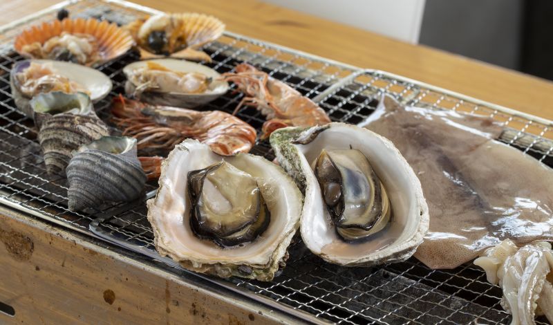メインは、杵築守江灣産の「カキ盛り」と各地の海の幸を集めた「海鮮焼き」。存在感たっぷりのカキはもちろんのこと、ホタテや佐伯産のヒオウギ貝、ホンビノス貝、イカの一夜干しなど、その日仕入れた新鮮な魚介類の盛り合わせは、ふたりでシェアしてちょうどいいボリューム。殻付きのカキをじっくり焼いている間に、食べ頃に焼ける海鮮を楽しめます。仕入れ狀況によっては、『大入島(おおにゅうじま)オイスター』『中津ひがた美人』『くにさきOYSTER』など、生で味わいたい大分のブランドカキもラインアップ。7月?8月には、佐伯市から輸送されたカキが主役の「巖ガキ祭り」も行われます。