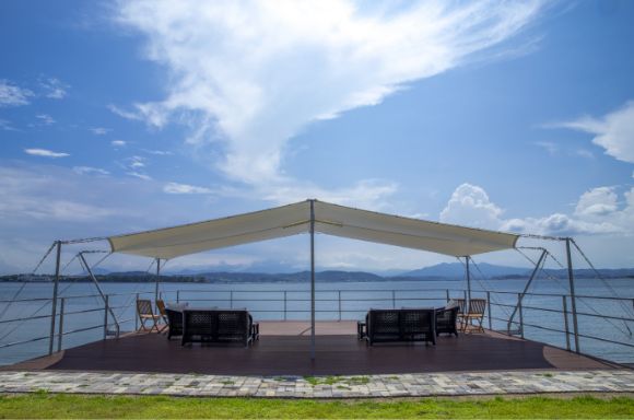 テラスから少し離れた場所でくつろげる「夕陽のデッキ」。美しくきらめく守江灣をひとり占めできます